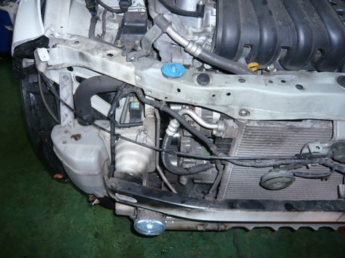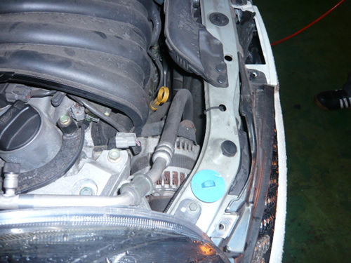 次に、上部サポートを外しますが、ヘッドライト下にもボルトで止まっているので、左右のヘッドライトをはずしてから、サポートを外します。
