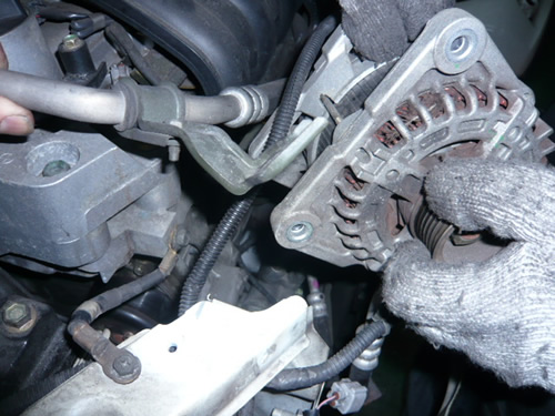 取り付けは、逆の要領で取り付けていきます。ステーにオルタネーターをはめ込み、ボルトを差し込みます。