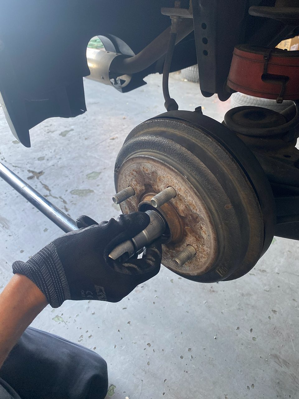 リアのホイールシリンダーからオイル漏れが見られたため、ホイールシリンダーのオーバーホールとブレーキオイルの交換を行いました。